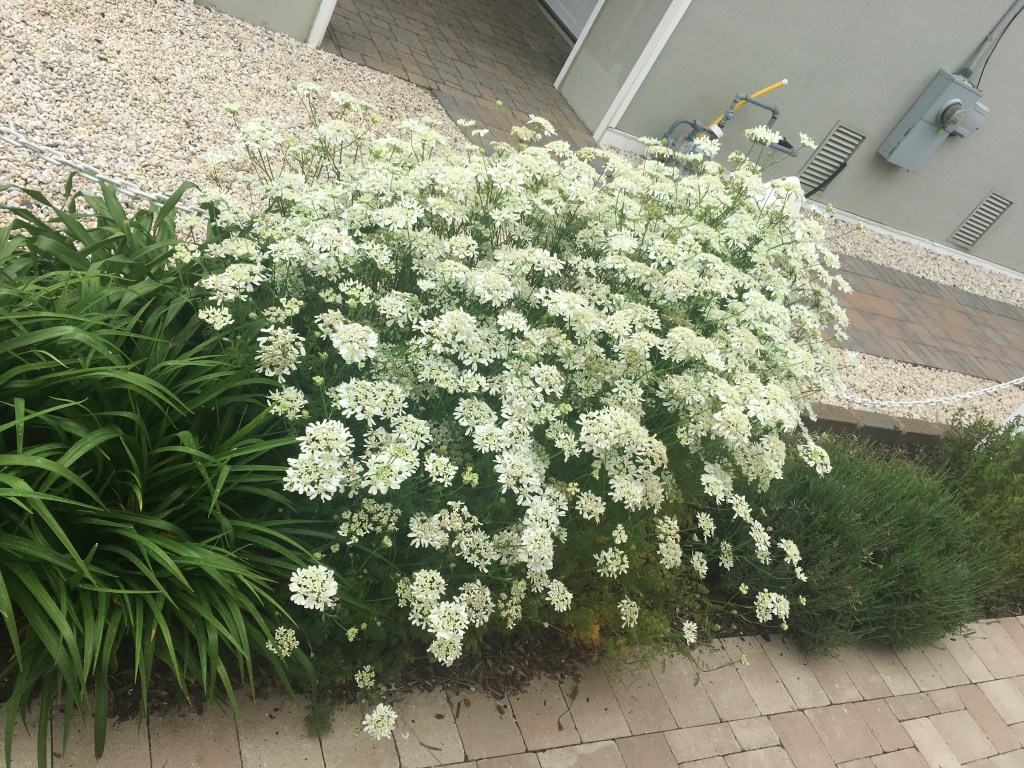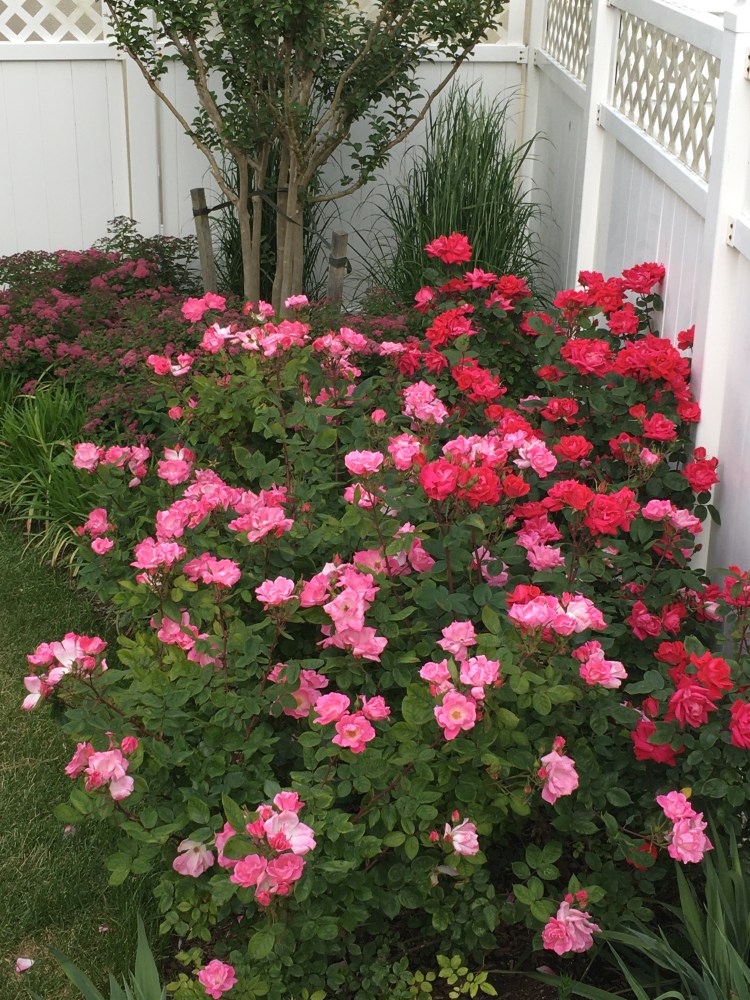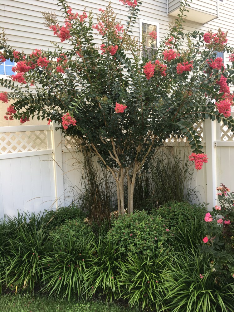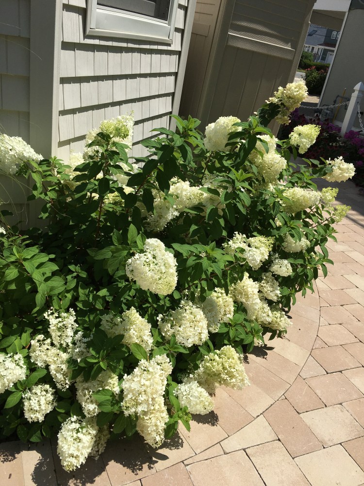 Entry to the rear of the property continues to offer a cool feel with an evergreen back border of Inkberry, Weigela floribunda, the shade of a silver Poplar, white panicled Hydrangea ‘Bobo’ and Hydrangea macrophylla ‘Twist-n-Shout’, three types of Japanese Forest, Liriope, two varieties of Knock Out Roses and a Tuscarora Crape Myrtle .