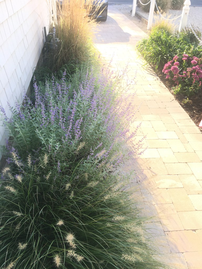 Design Elements: Warm bloom colors of yellow, orange and beige welcome visitors with the use of Daylilies, Coreopsis, Butterfly weed, Karl Foerster grass and more Hameln. Rugosa roses, front of house. Pennisetum orientale ‘Hameln’ grass mark side entry continuing beach feel.