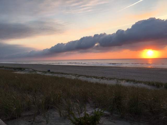 The garden’s bloom and foliage scheme, from warm to cool colors, provides a welcome oasis after hot hours on the beach. Above photo: a hot day dawns over the Atlantic Ocean.